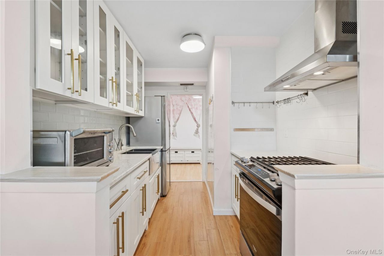 One of a kind apartment! No other layouts like this! Dreamy, airy HUGE one bedroom with South East exposure. Brilliant natural light. Stunning renovations throughout. Hardwood floors, amazing closet space including walk-in. Custom designed kitchen with deep stainless steel sink, appliances and granite countertops. Sleek bathroom with walk-in shower, rain shower and hand held fixture and heated towel rack for that spa-like feeling in your own home. King-sized primary bedroom with fabulous barn door and soundproof windows. 24 hour doorman, CAC ALL UTILITIES INCLUDED, gym, parking offered , seasonal pool club and pets welcome. May sublet after two years of ownership with Board Approval for three years. Express bus to NYC at corner. Two blocks to train. Have it all!