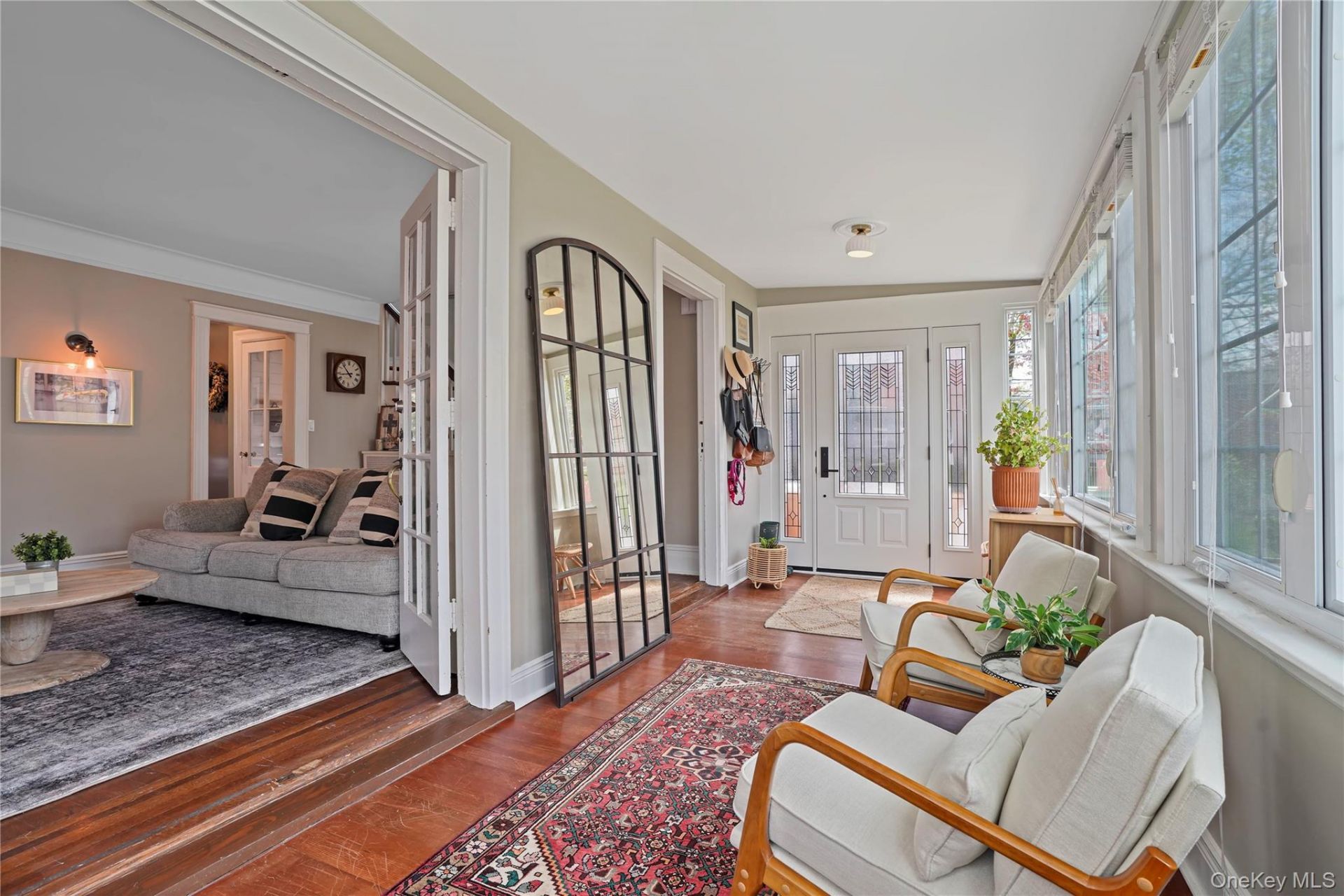 This charming Colonial has an easy vintage modern feel, beginning with a welcoming entry sunroom lined with windows on three sides that bring in beautiful natural light. The living room is warm and full of character, centered around a wood burning fireplace with built ins and distinctive stained glass accents, while French doors create an easy, connected flow between rooms. The dining room is spacious and inviting, with access to the backyard that makes both everyday living and entertaining feel natural. The kitchen has been thoughtfully updated with a farmhouse sink, quartzite countertops, stainless steel appliances, and generous cabinetry, along with double windows overlooking the yard. Upstairs, you will find three comfortable bedrooms and an updated hall bath. The backyard is a true highlight, level and fully fenced with a lovely patio well suited for outdoor dining or relaxing. Important updates including a new roof, boiler, and windows have already been completed, offering both style and substance.